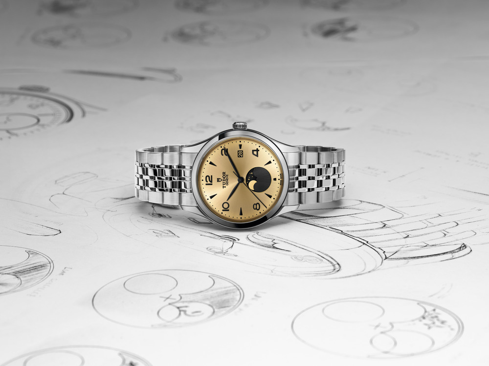 TUDOR 1926系列低調穩重卻又別富韻致,是包容奇思妙想的理想之選。該系列得名自勞力士創辦人漢斯・威爾斯多夫(Hans Wilsdorf)註冊「The Tudor」商標的年份。無論是美學還是理念,均忠實貫徹帝舵表的製錶哲學。在此基礎上,周杰倫與帝舵表設計師通力合作,如同施展魔術般,創造出有如滿月清輝照亮夜空的非凡之作。新款腕錶採用39毫米不銹鋼錶殼,月相指示位於6點鐘位置,邊緣為磨光斜切設計,背景則以襯以三款全新錶面──藍色、黑色及周杰倫獨創的香檳色。不同錶面的月相指示也各不相同,尤其香檳色錶面錶款更是別具巧思:代表月亮的幻月金色圓盤隨時間流逝逐漸消失在墨黑色鏤空窗之後,生動還原了月亮盈虧變化的全過程。