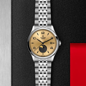 香檳色錶面,飾以太陽放射紋,配立體鐘點標記及月相指示